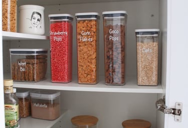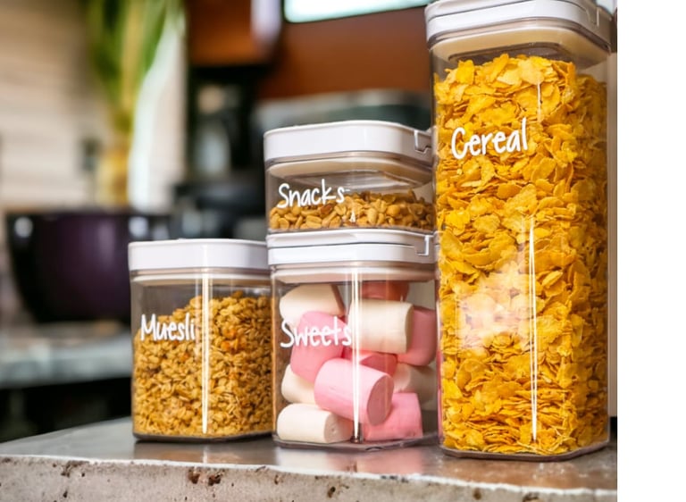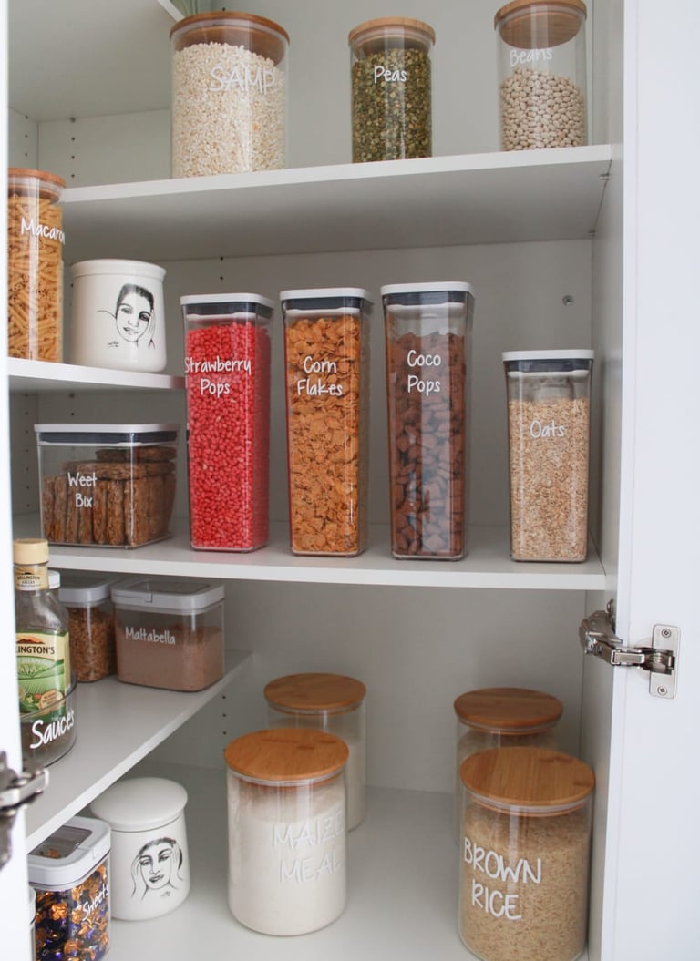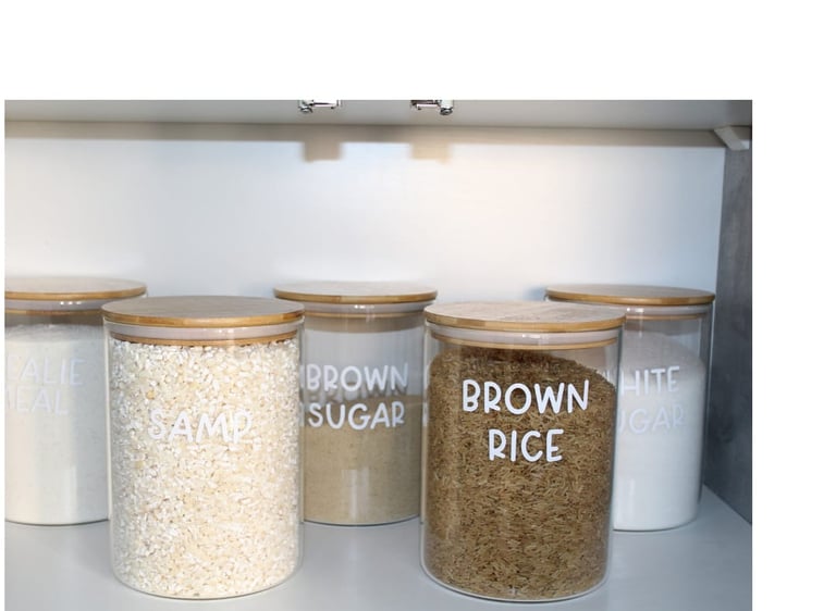 Dry groceries kept fresh and clean in clear labelled canisters